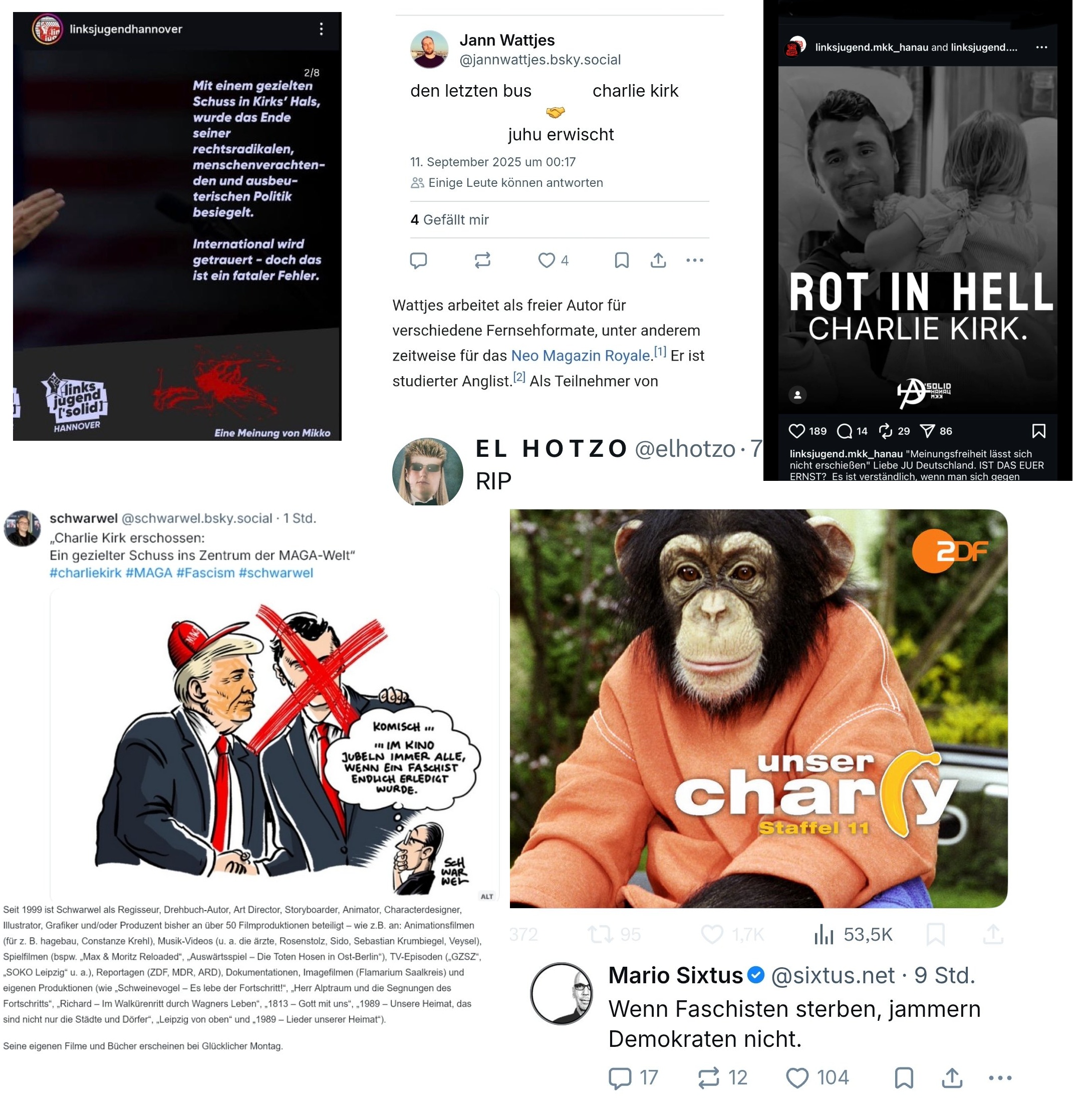 In den USA wird ein politischer Mord verübt. Was hat das mit uns zu tun? In Amerika sind die Zustände viel zugespitzter, Fronten verhärteter? Ausserdem war es nicht ein Einzelfall? Nein, es ist kein Einzelfall. Und es betrifft uns. Denn die Linke in Deutschland freut sich des gewaltsamen Todes eines Menschen. Es sind viele, die sich darüber freuen, dass ein Mensch ermordet wurde. Es sind Linke, die sich darüber freuen, dass ein Mensch getötet wurde. Und wir müssen keinen Zweifel daran haben, dass sich diese Linken auch über den Mord an einem politischen Gegener freuen würden, wenn es in Deutschland passieren würde. Nur ein kleiner Auszug aus den Reaktionen im Bild. Links tötet!